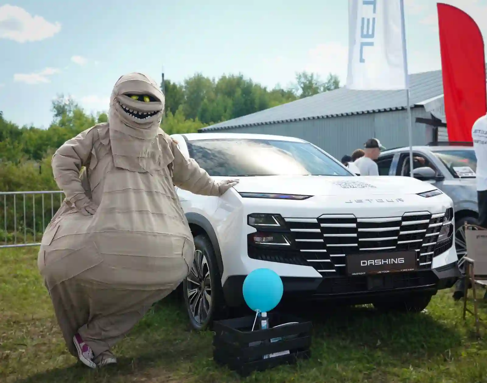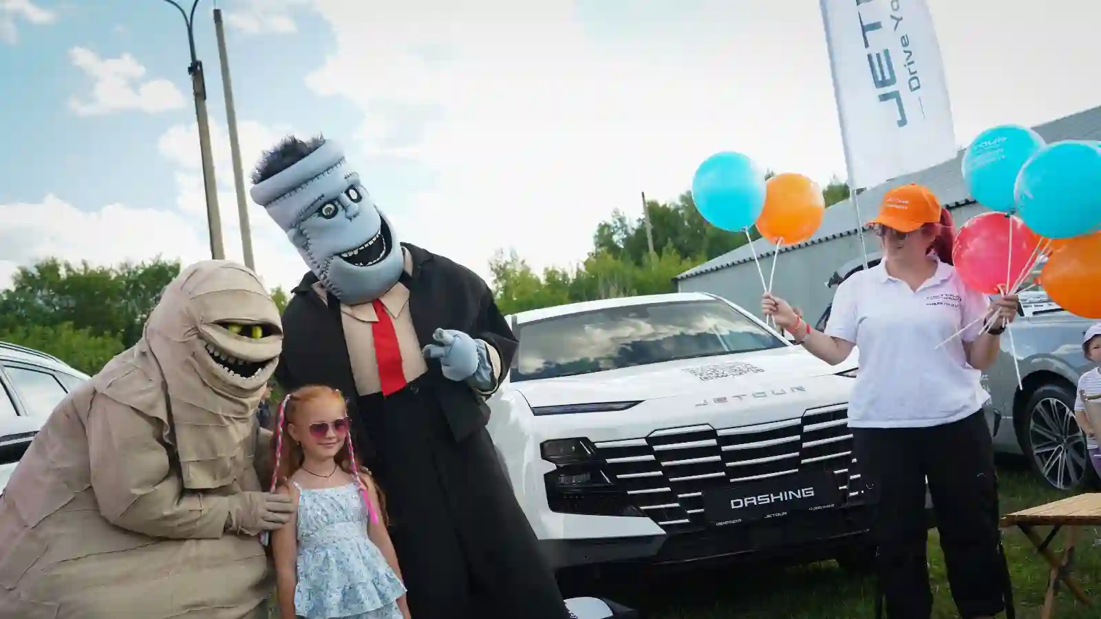 Гостей мероприятия прямо на входе ждал наш яркий и стильный Jetour Dashing , а так же веселые аниматоры Мумий и Фрэнк , с которыми маленькие гости могли вдоволь наобниматься и , конечно же , пофотографироваться !